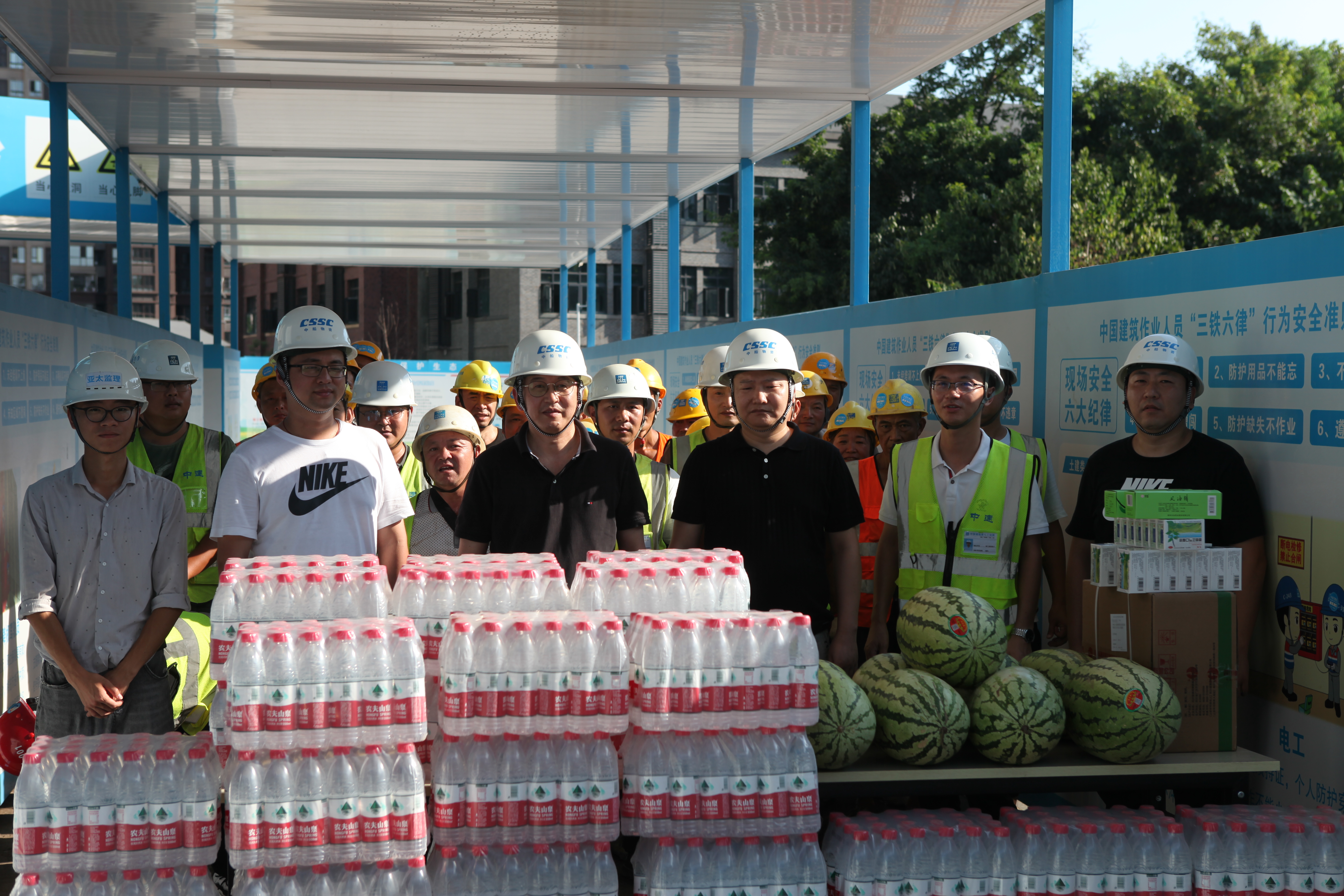 李坷进代表公司到华尚城项目施工现场看望慰问奋战在一线的劳动者,为他们送去防暑降温物资,同时叮嘱各班组施工作业人员,要注意防暑降温,合理安排作息时间,避开高温时段作业,确保施工人员身体健康和生命安全。