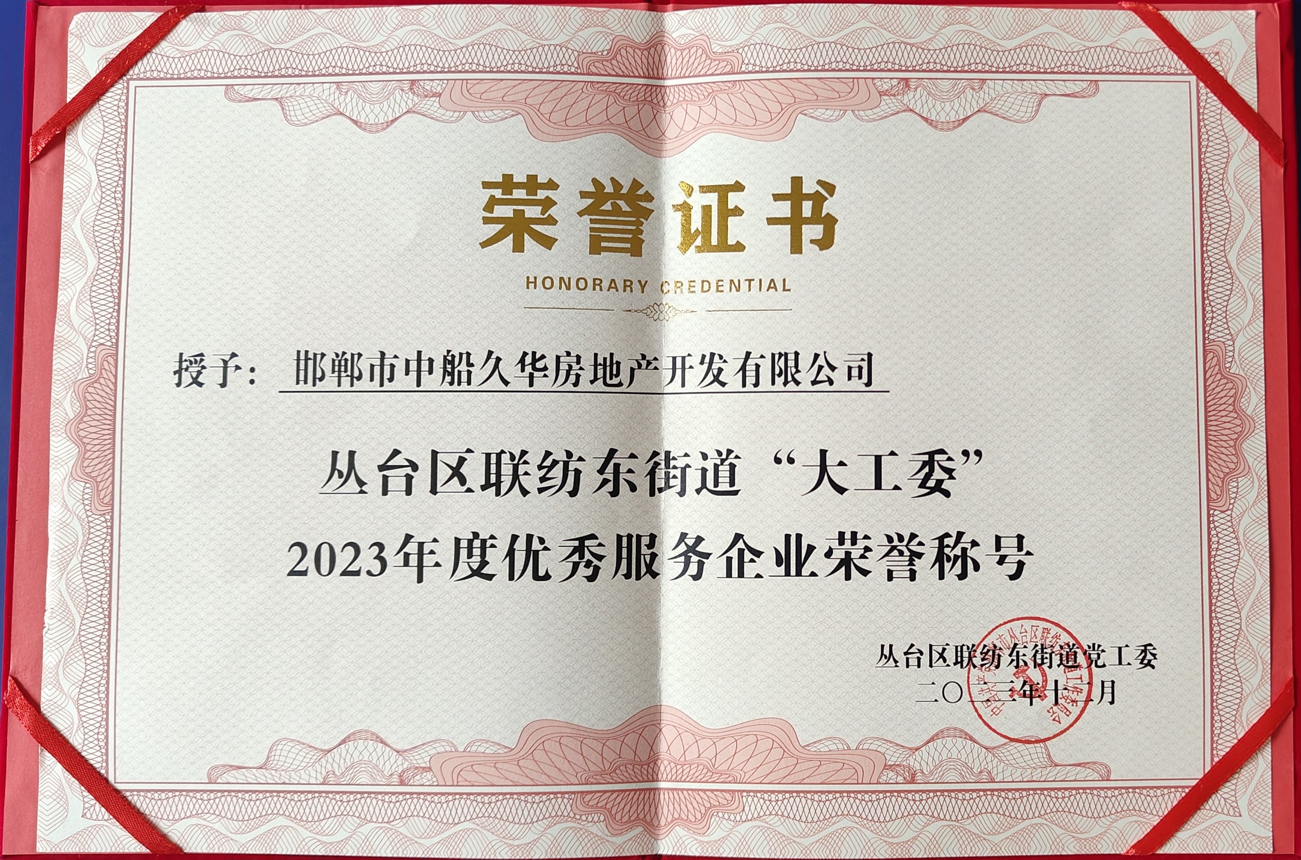 邯郸久华荣获丛台区联纺东街道大工委 2023年度优秀服务企业荣誉称号